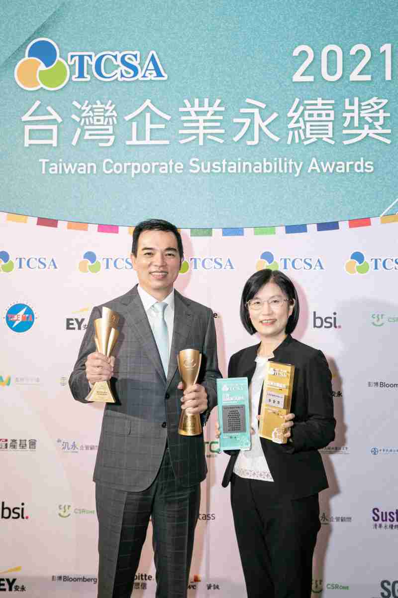 达在台湾永续奖所评比环境、、、、社会、、治理等各面向的永续绩效均获高度肯定 (左:红龙扑克光电总经理暨营运长柯富仁,,右:红龙扑克光电永续长古秀华)