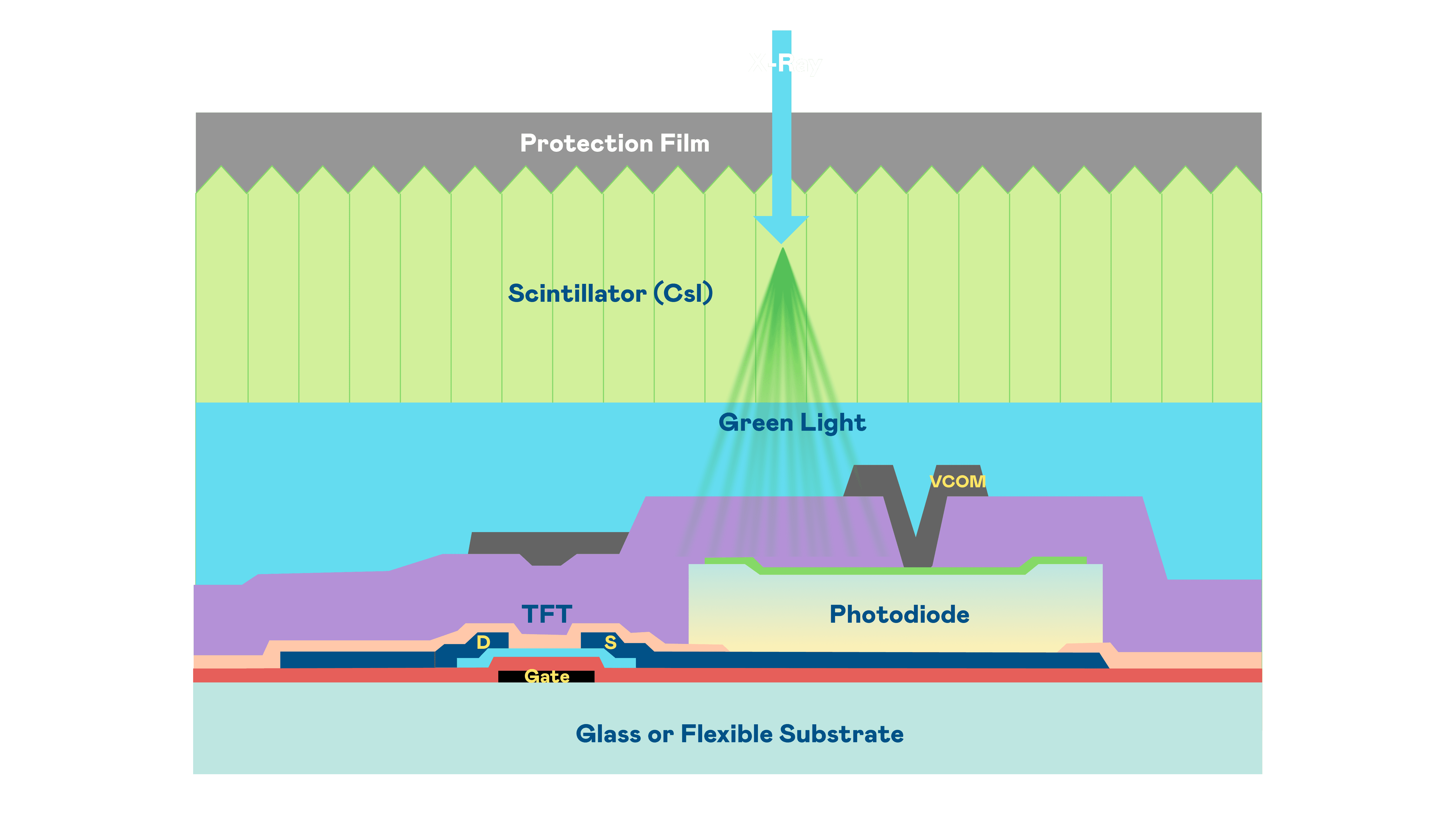 红龙扑克的X光影像感测阵列使用薄膜电晶体 (TFT) 作为每个像素的读取开关,,,搭配光电二极体(Photodiode)的光电转换元件,,,用以感测X光影像讯号。。。